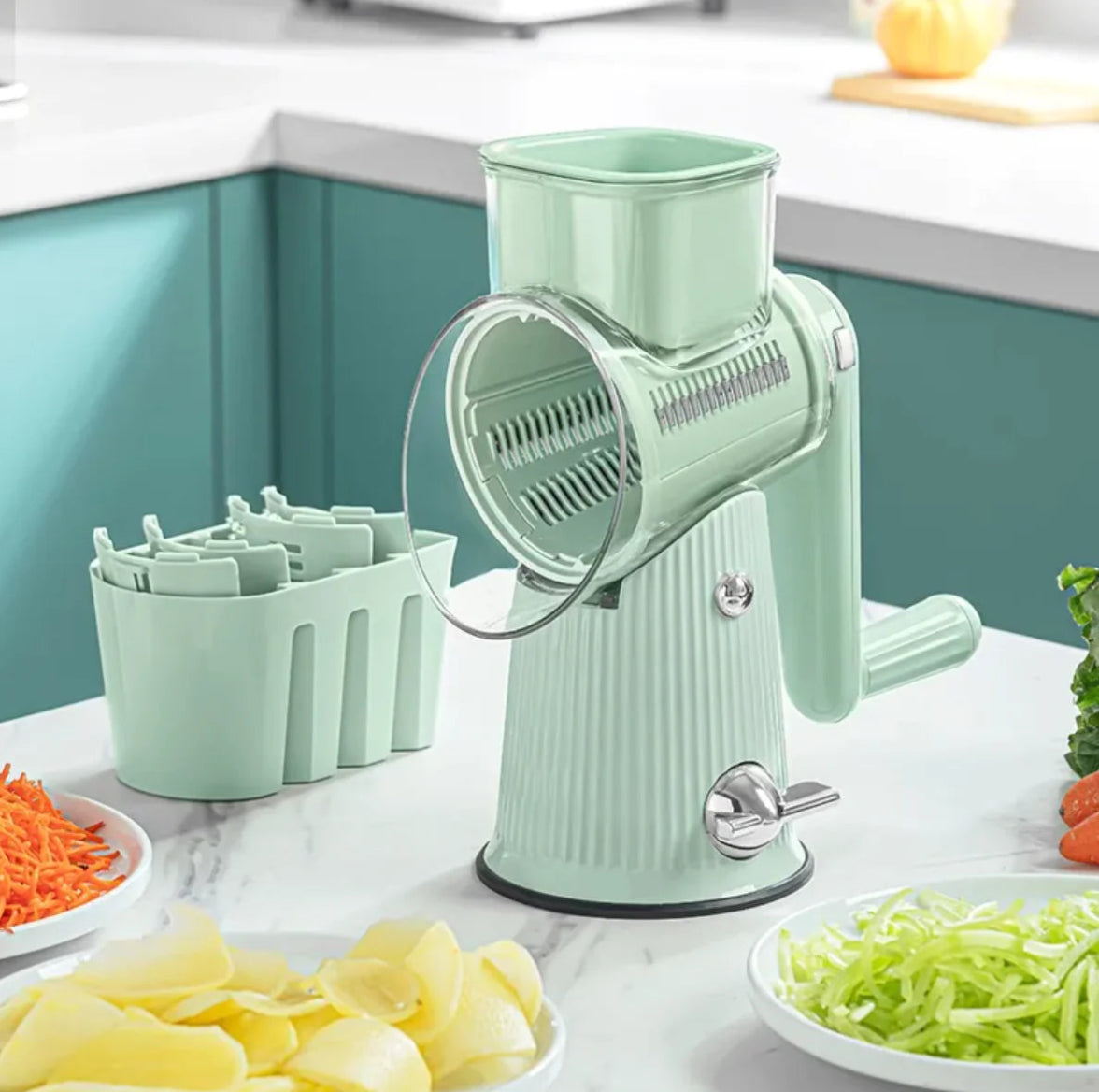 This high-quality hand-cranked vegetable slicer is built for durability, precision, and everyday use. Made from food-safe materials with sharp, rust-resistant stainless-steel blades, it delivers smooth, reliable performance without electricity. Easily slice vegetables into even rounds, create wavy slices, shred in two different sizes, or grind firmer ingredients with consistent results. The smooth hand crank provides effortless control, while the enclosed cutting system, food pusher, and strong suction base ensure safe, stable operation. Easy to clean and compact to store, it’s a versatile, long-lasting tool designed to make food preparation faster and more enjoyable.